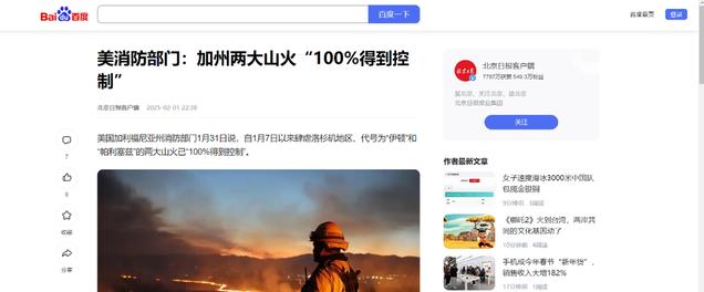 信息来源:北京日报客户端2025-02-01美消防部门:加州两大山火“100%得到控制