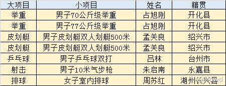 衢州和绍兴情况相同,举重和皮划艇都是一人获得两块,其他项目分别是乒乓球、射击和排球。