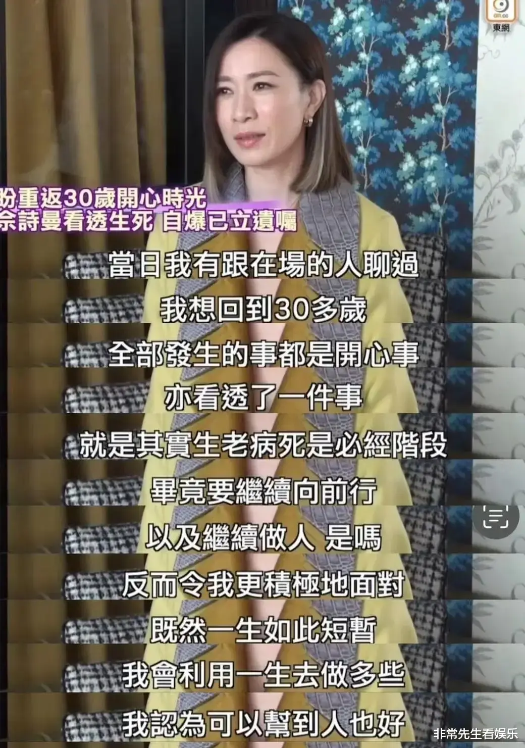 如此看来,立遗嘱这件事从佘诗曼口中轻轻松松说出来,一点也不是什么悲观的事,而是想通了之后的务实。