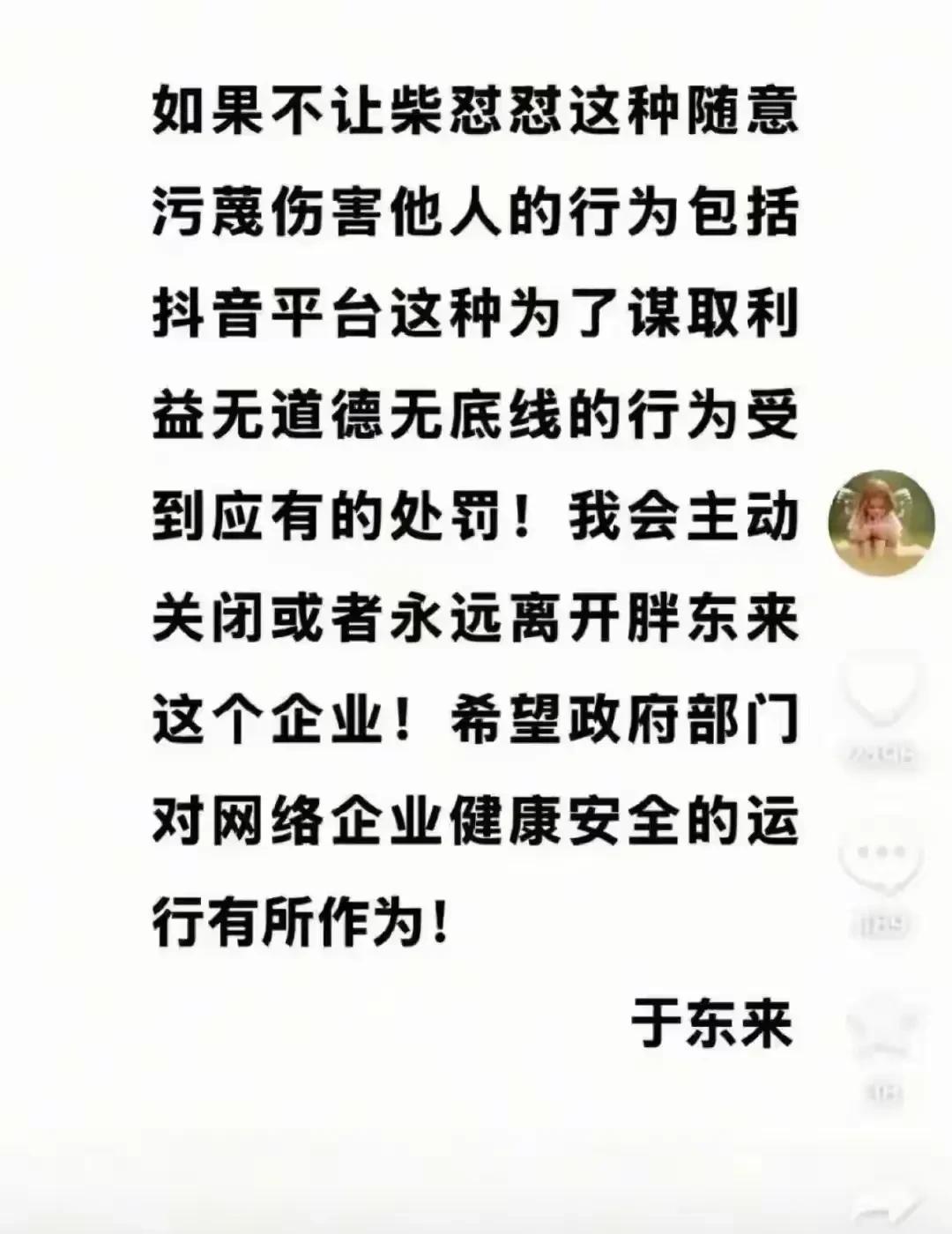 这事让胖东来的创始人于东来气得够呛。要说他这人本来脾气还可以,但碰上这种泼脏水的操作,忍也忍不了,直接删掉了自己社交平台的所有视频,一边发文怒怼柴怼怼,一边表示一定要追责到底。如果这事儿处理不好,甚至他连公司都不想开了!听听这决心,气性真不小。