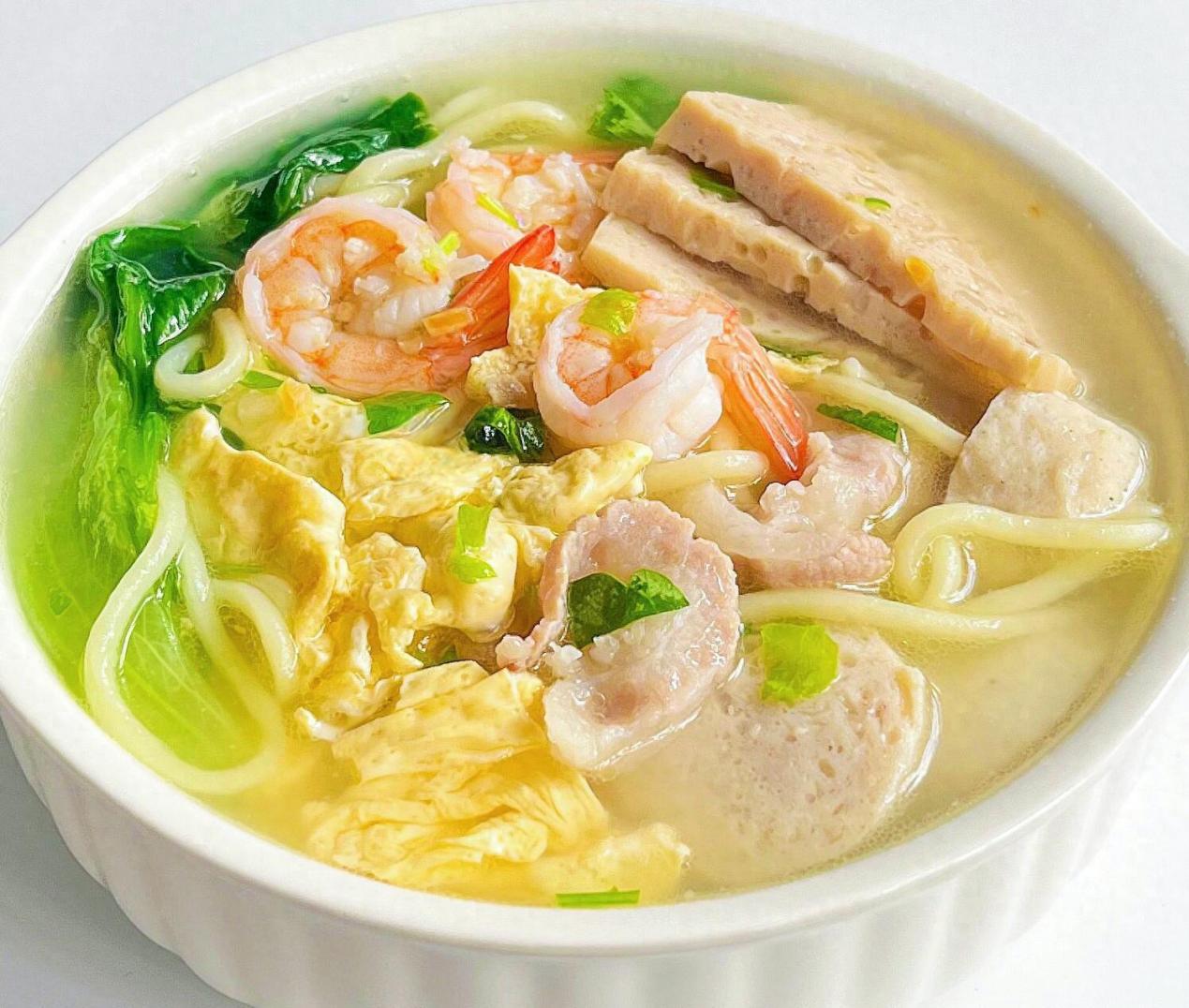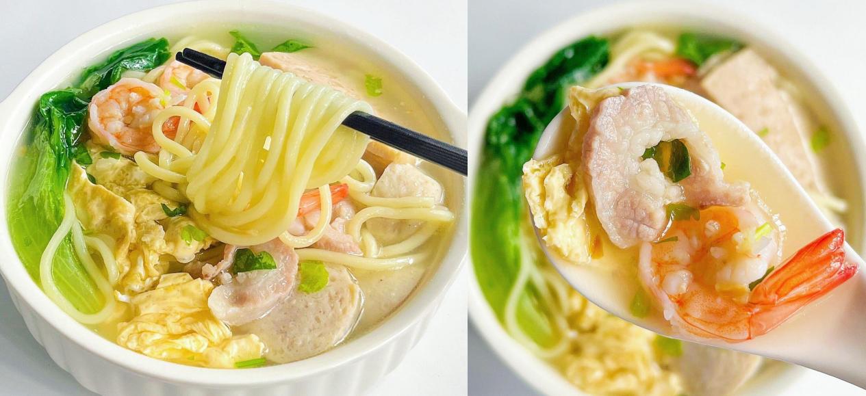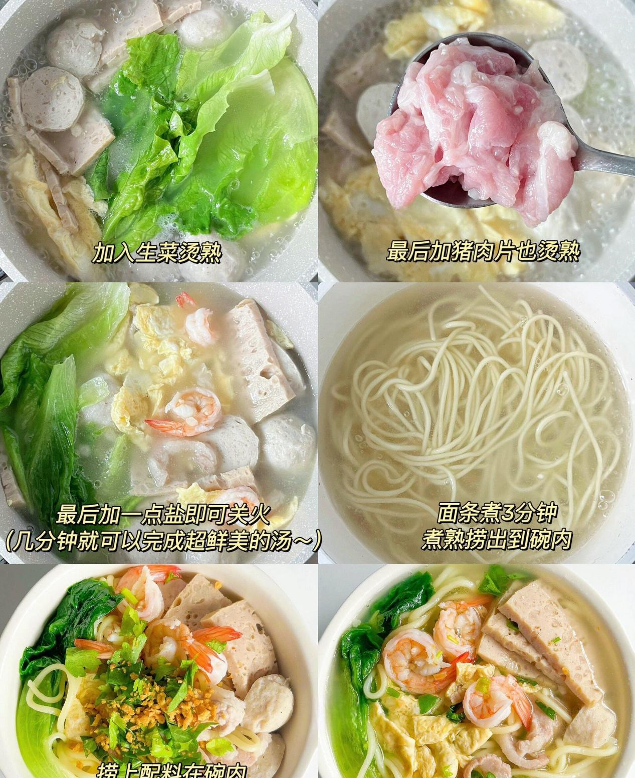 接下来,锅中倒油,油热后打入鸡蛋液,先煎至微微成型,再翻炒散开。然后加入提前准备好的骨头汤,若没有骨头汤,开水也是可以的。将汤底煮开后,加入猪肉丸和猪肉饼,煮三分钟,随后再放入虾仁和生菜,继续煮一两分钟。最后调味,加盐和鸡精,捞出配菜,放在面条上,最后将汤底浇上去,简单又好吃。