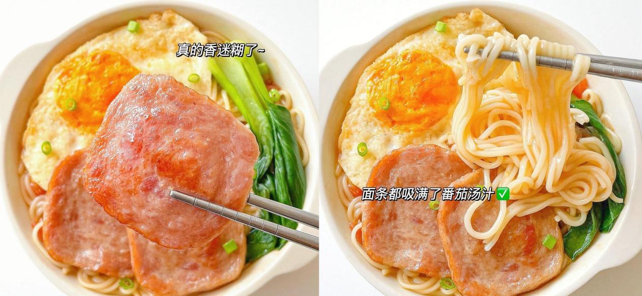 番茄鸡蛋浓汤面是另一款简单又美味的选择,适合那些喜欢酸甜口味的人。首先,准备好番茄和午餐肉,番茄去皮切块,午餐肉切片,青菜洗净备用。接下来,锅中倒油,油热后打入鸡蛋,煎至两面金黄,再将午餐肉放入锅中,与鸡蛋一起煎至微焦,盛出备用。