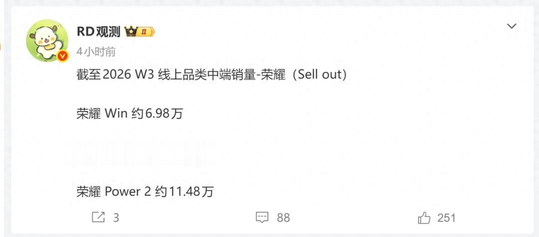 根据RD观测公布的数据,截至到2026年W3(2026年1月18日)荣耀Win系列的总激活量达到了21.67万台,顺利突破20W+的激活量。
