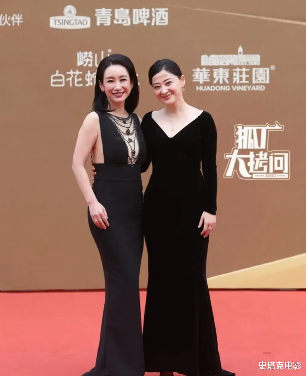 两位女演员都身穿黑色的鱼尾裙,但是却不是完全的黑色,而是做了很多时尚的设计,比如秦海璐的蕾丝质感,梅婷的深V,这是属于这个年龄段的高雅和魅力,两人牵手扶腰走红毯,相当有爱。