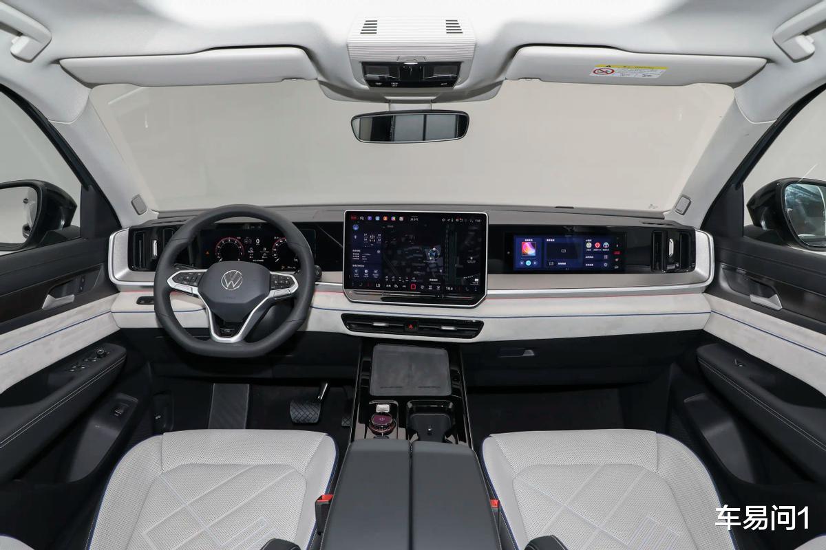 从座舱中来看,揽巡的三辐式方向盘与车门窗控制保持不变,但在方向盘前端的10.25英寸数字仪表变为了嵌入式;而在独立悬浮的15英寸触控屏右侧还布局了11.6英寸副驾娱乐屏,并且包括两端的出风口在内都融入了这些屏幕的承托面板中。配合U型金属环绕、翻毛贯穿装饰,中控台除了有科技感外,也在变得比过去更具档次性。