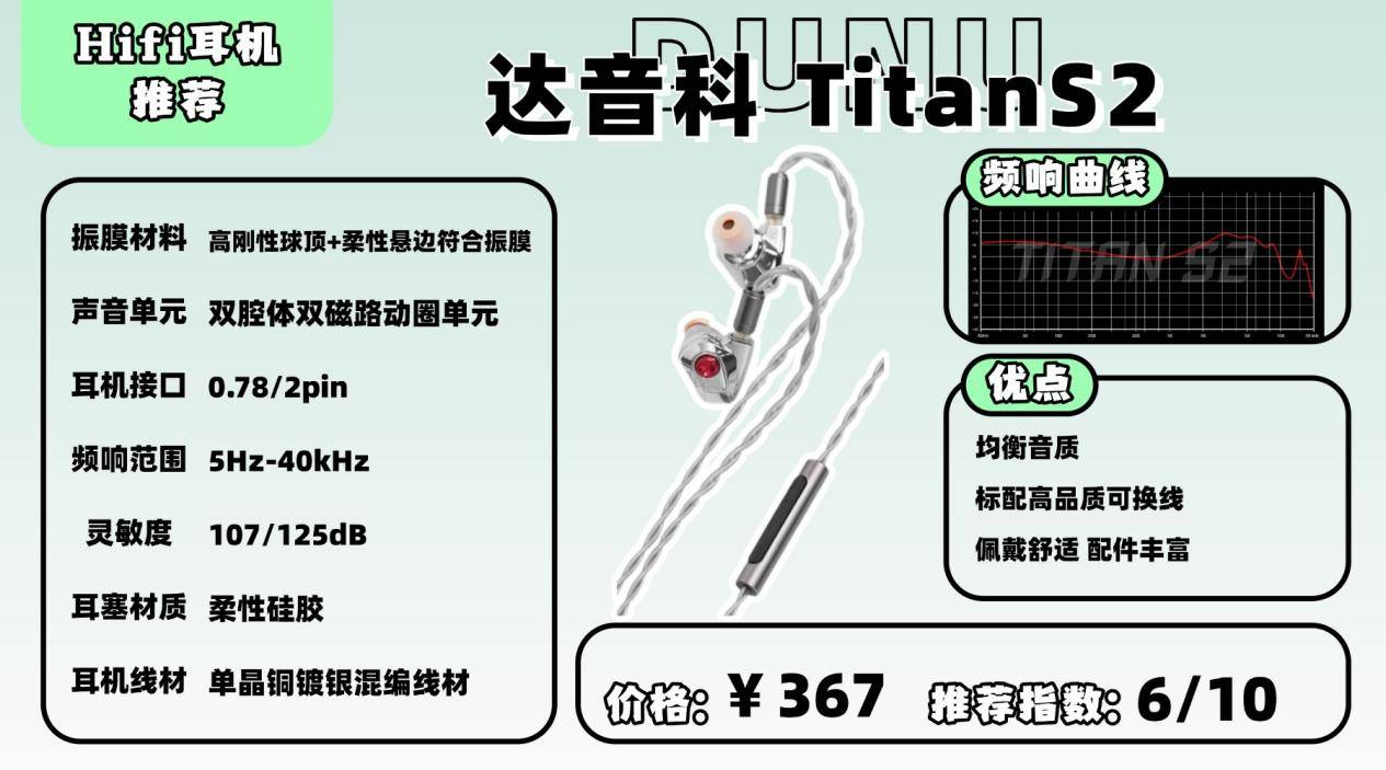 它最大的特点就是调音方式灵活,不同导管能带来明显差异。整体风格偏热情,声音有冲劲。低频收放自如,量感适中,层次感也不错;中频人声清晰,细节表现足够;高频解析力偏强,乐器线条能听得比较清楚。耳机采用第二代柔性悬边锂镁合金振膜和双磁双腔体结构,这些配置让动态和还原度都保持在一个稳定水平。不过这种偏亮、能量感较强的风格,长时间听可能会有点累,而且声场规模不算特别开。