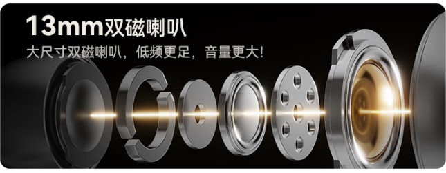 音质做了三重升级,听感直接能跟千元耳机比一比。喇叭用的是 13mm 双磁单元,靠两个高精度叠加的磁铁加强磁场,不仅声音更清楚,音量也更够劲;还有气旋式引擎腔体技术,做成了圆柱形的铝合金金属腔体,能有更多的气流,能有更大的劲去推动声音,重低音特别震撼;再加上石墨烯科技振膜和虹觅声学实验室的调音,整体音质很稳很清晰,表现非常好。在 500 块以下的耳夹式耳机里,它的音质表现真的数一数二。