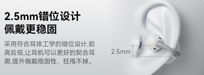 虹觅这款的佩戴舒适度真的非常好,耳机采用 2.5mm 错位设计,戴在耳朵上是前高后低的状态,很贴合耳朵形状,佩戴稳固性好。而且它还有∠ 12° 弧面耳托,把耳机电池部分做成弧形,能贴紧耳背,提升佩戴舒适度。单个耳机只有4.5 克,佩戴很轻松。
