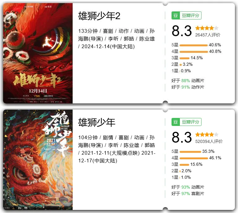 口碑过硬的新片豆瓣开分都快,《雄狮少年2》刚上映第一天就开分,并且达到了8.3,与前作一样。甚至本作的5星占比还要高于前作。
