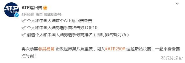 毫无疑问,这就是中国网球史上最伟大的一场男单胜利,凭借这场半决赛的胜利,吴易昺将中国男子网球带到了多个全新的高度:ATP巡回赛决赛,世界排名第76,首次击败TOP10。