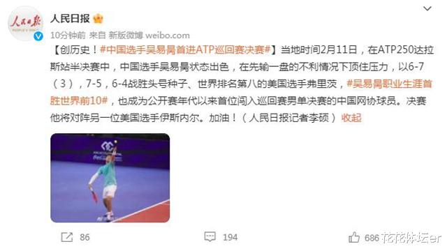 对于吴易昺所取得的这场历史性胜利,央视+人民日报狂赞,人民日报官方社媒账号评价:创历史!中国选手吴易昺状态出色,在先输一盘的不利情况下顶住压力,以6-7(3),7-5,6-4战胜头号种子、世界排名第八的美国选手弗里茨,成为公开赛年代以来首位闯入巡回赛男单决赛的中国网协球员。决赛他将对阵另一位美国选手伊斯内尔。加油!