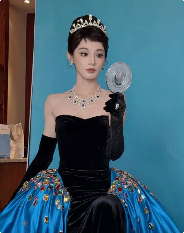 彭小苒身着黑色抹胸搭配蓝色拖尾礼服,头上还佩戴了钻石王冠,打造复古优雅的公主感。