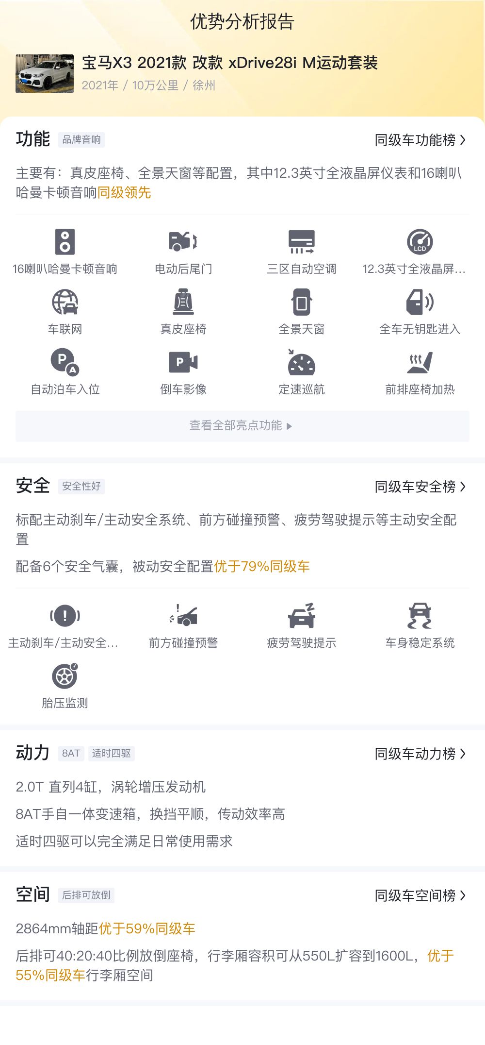 买二手车,配置要实用。这辆宝马X3 2021款 改款 xDrive28i M运动套装配备了M运动套件、全景天窗等配置,其中12.3英寸全液晶屏仪表和16喇叭哈曼卡顿音响同级领先。在安全性方面,它标配主动刹车/主动安全系统、前方碰撞预警、疲劳驾驶提示等主动安全配置,配备6个安全气囊,被动安全配置优于70%同级车。值得一提的是,它的整体安全系数在同级车中处于领先地位。在动力方面,它搭载了2.0T 直列4缸,涡轮增压发动机,8AT手自一体变速箱,换挡平顺,传动效率高,适时四驱可以完全满足日常使用需求。车内空间宽敞,乘坐舒适,无论是日常通勤还是长途旅行,都能为乘客提供舒适的体验。总的来说,这是一辆配置丰富、性能出色、舒适度高的二手车,非常值得关注。