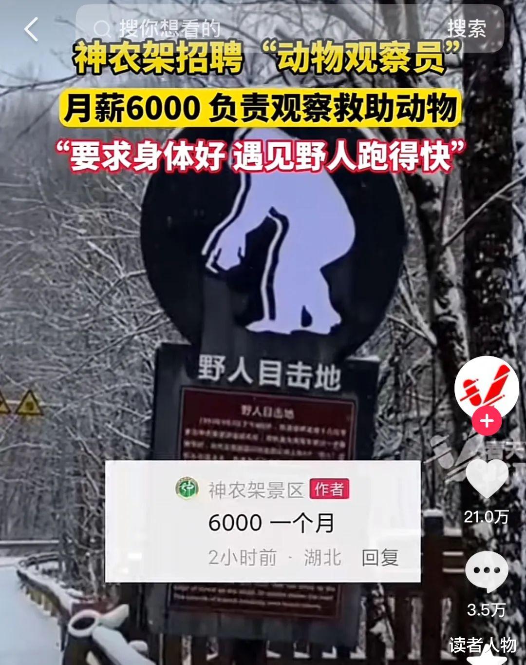 神农架景区发布了“自然观察员”招聘,月薪6000元一个月,待遇和本溪关山湖风景相近。