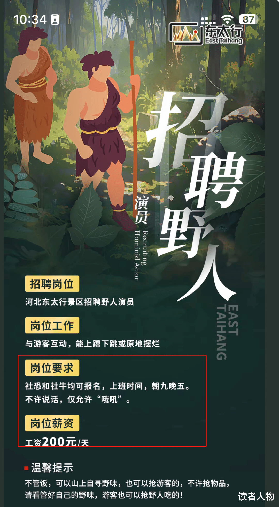 无独有偶,河北东太行景区也公开招聘“野人”。