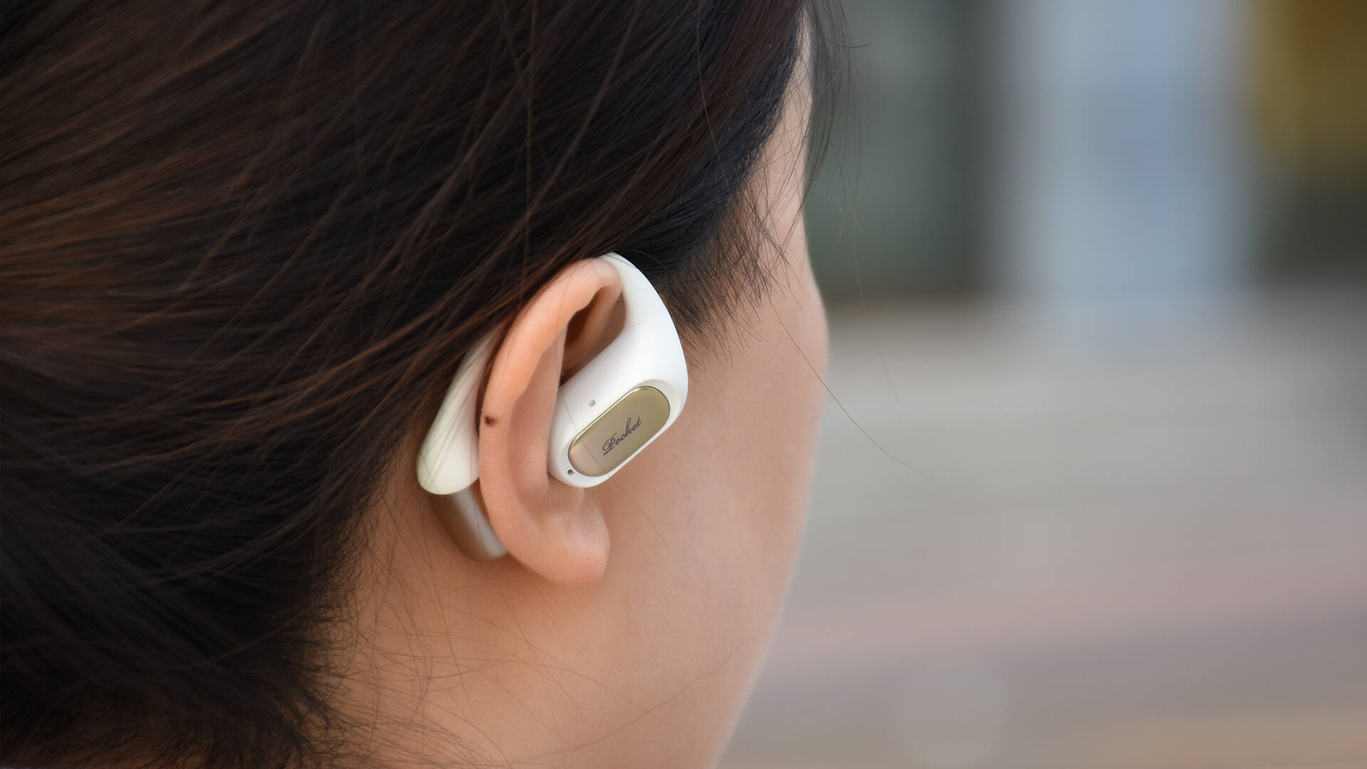 两只耳机属于经典的耳挂式形态,在暖白色的基础上加入浅金色点缀,不显单调。高弹记忆钛丝材质的耳挂柔软且具有韧性,久经使用不容易变形,耳挂及腔体内侧和皮肤接触的位置均为亲肤的硅胶材质,触感柔软亲肤,不容易过敏。