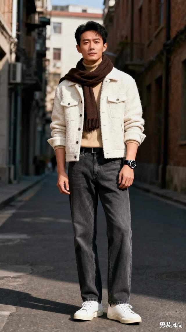 米白色粗呢外套+浅驼色高领毛衣+深灰色直筒西裤,温柔的浅色系组合,适合城市休闲场景,搭配黑色复古腕表,平衡浅色系的轻飘感。