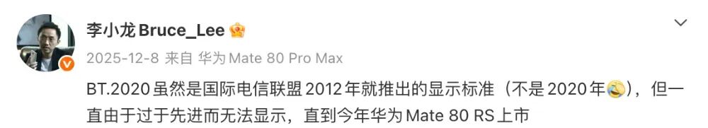 此前,华为终端BG CTO李小龙曾提到过:“BT.2020虽然是国际电信联盟2012年就推出的显示标准(不是2020年),但一直由于过于先进而无法显示,直到今年(2025年)华为Mate 80 RS上市”。