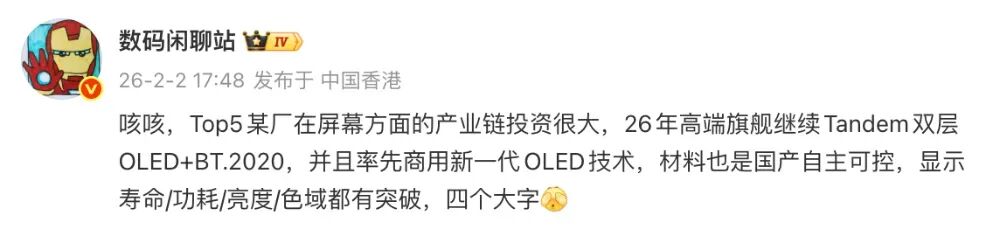 Top5某厂在屏幕方面的产业链投资很大,26年高端旗舰继续Tandem双层OLED+BT.2020,并且率先商用新一代OLED技术,材料也是国产自主可控,显示寿命/功耗/亮度/色域都有突破,四个大字