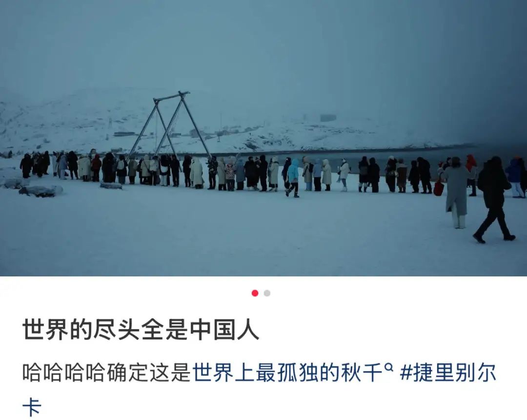 最近被国人拿下的又一“孤单地标”是俄罗斯最北小镇捷里别尔卡,今年春节期间,这个小镇上号称【世界上最孤单的秋千】前排满了中国人,“排队1小时,拍照6秒钟,一扭头全是老乡”。