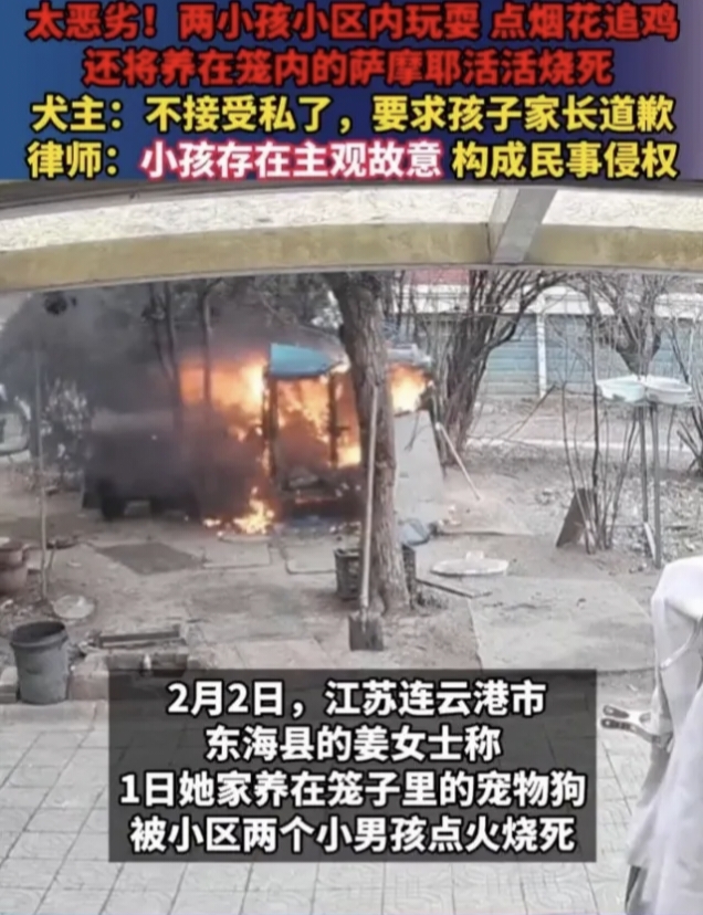 连云港,一只关在笼里的萨摩耶,被熊孩子一把火活活烧死,凄厉惨叫让人心碎。