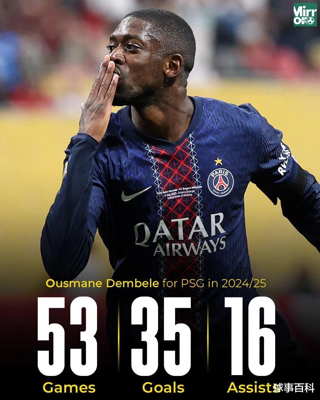上赛季,登贝莱在巴黎圣日耳曼迎来了大爆发。他不仅保持了超高的出勤率,单赛季踢了53场比赛,创下个人职业生涯纪录。同时也在53场比赛中贡献了35球外加14次助攻,进球效率飙升。在恩里克的悉心调教之下,登贝莱在9号位上大放异彩,帮助巴黎拿到了队史首座欧冠冠军奖杯和第13座法甲联赛冠军。随后,登贝莱在9月份的金球奖评选中击败了17岁的亚马尔,成功当选为金球先生。
