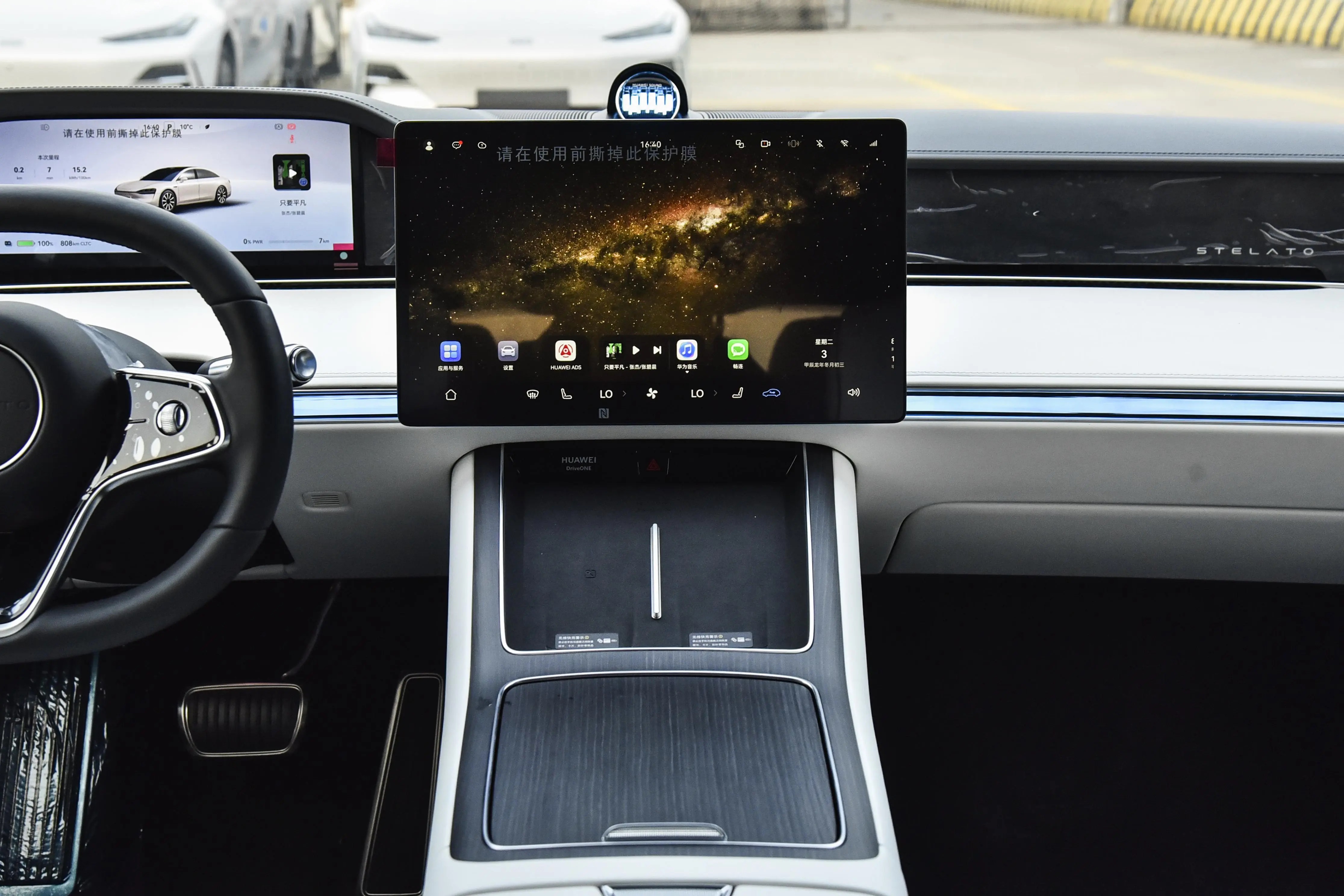 享界S9的四个车窗均采用双层夹胶隔音玻璃,全系标配顶棚物理遮阳帘,后窗、后风挡电动遮阳帘,后三角窗手动遮阳帘。全车共有前排Type-C充电口2个和前排无线充电位2个,后排Type-C充电口1个以及后排无线充电位1个,无线充电功率可达50W。另外还配备后排专属秘书屏,支持0-45度旋转调节,可控制座椅、空调、冷暖箱、音量、屏幕等;还配备有二排老板座小桌板,以及华为MagLink的13.2英寸平板。最亮眼的当属配备的32英寸车规级投影巨幕,可通过中控屏或扶手屏进行视频内容播放,让整车更具有娱乐性。