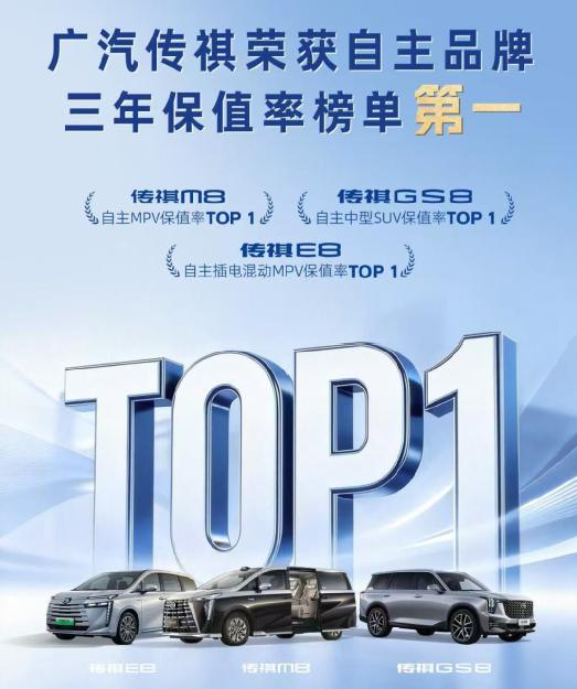 在最新发布的由中国汽车流通协会和精真估联合发布的《2025年度中国汽车保值率报告》中,广汽传祺拿下了自主品牌三年保值率榜单第一,并且实现连续三年蝉联榜首。