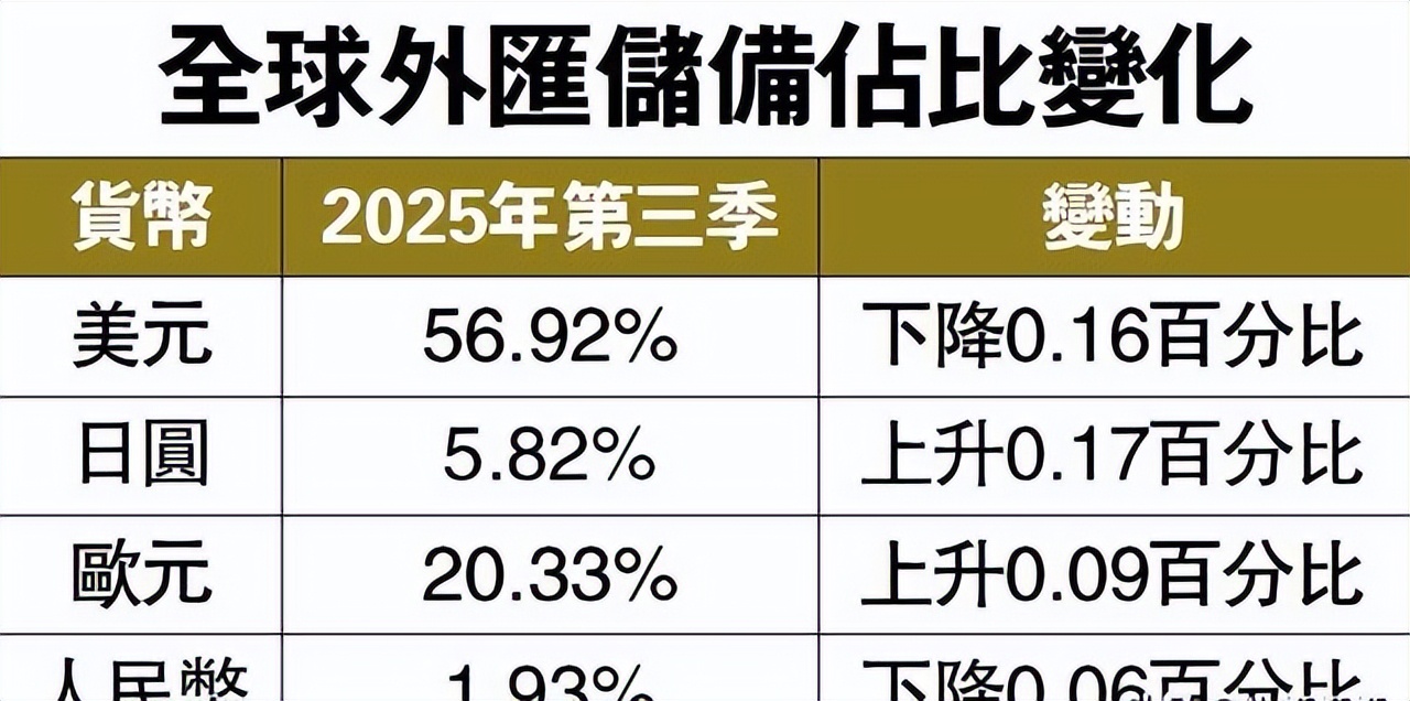 2025年第三季度,美元在全球外汇储备中的占比,一头栽到了56.92%。