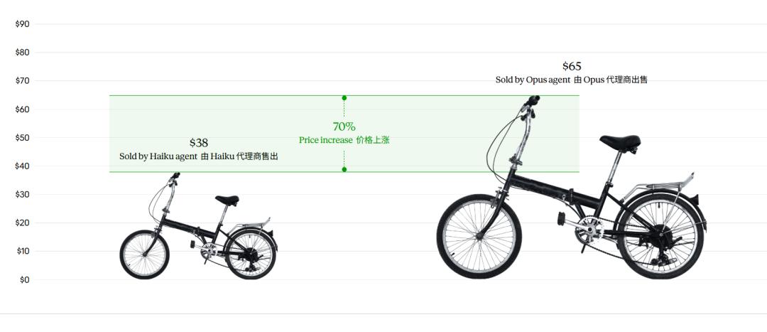 最具说明力的单案例对比,是一辆破损折叠自行车:Haiku 智能体将其以 38 美元成交;面对同一个买家、同一件商品,Opus 智能体的最终成交价为 65 美元,价差高达 70%。