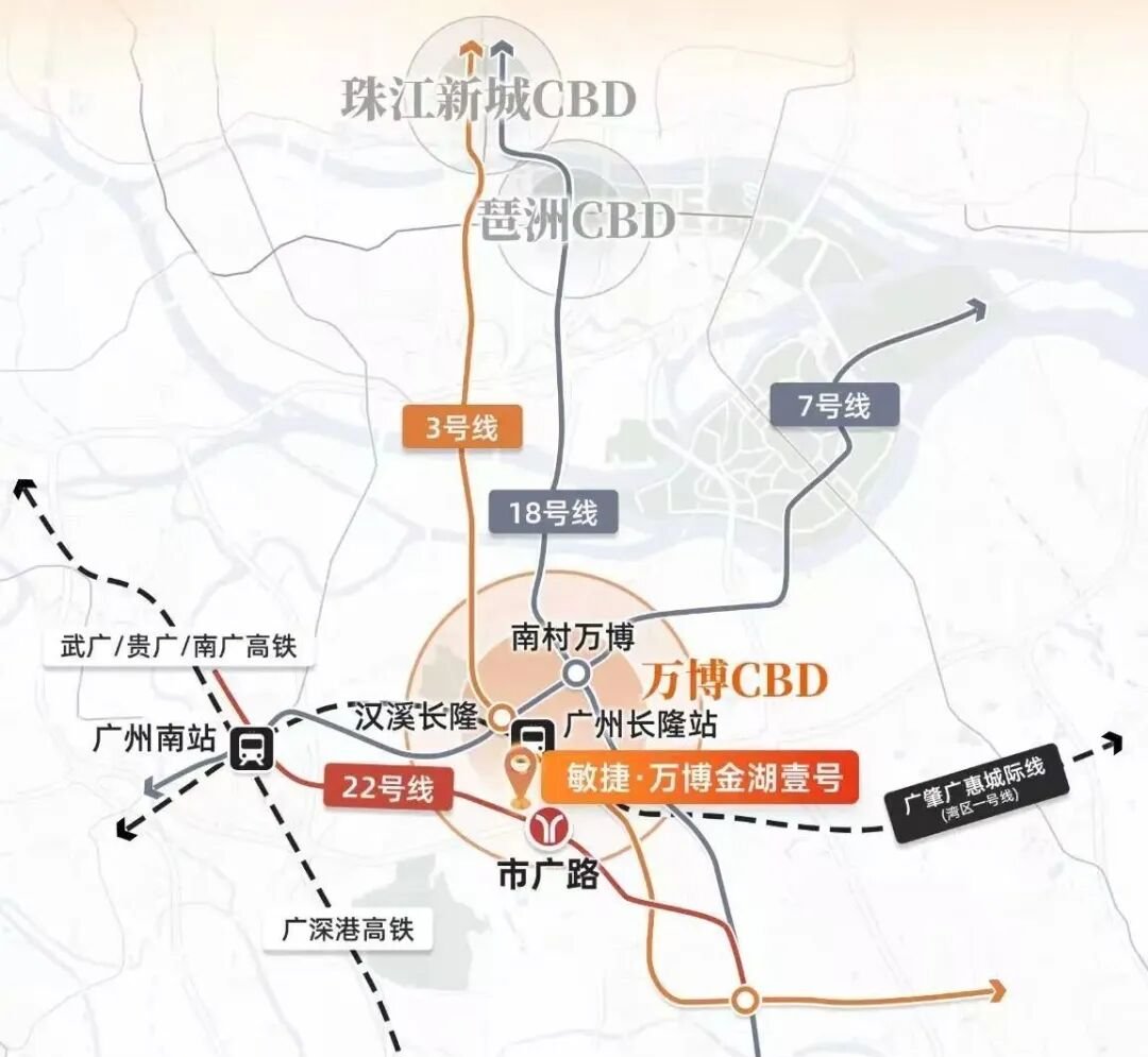 区位与交通优势显著:项目地处万博CBD核心区域,享受高端商圈配套。距离地铁22号线市广路站约800米,能快速通达番禺广场、万博中心、琶洲CBD及珠江新城。规划中的26号线也将在此交汇,加之“五纵五横”的立体交通网络,公共交通和自驾出行都较为便利。
