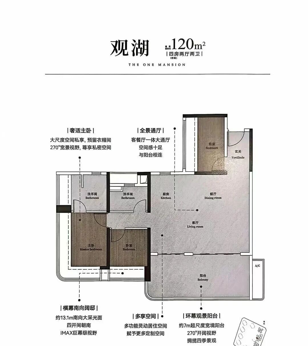 132㎡户型配备环幕双景阳台,270°视野尽收湖景与园景。