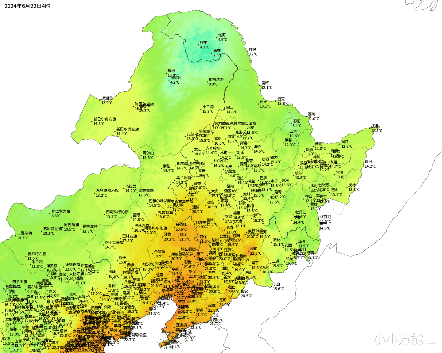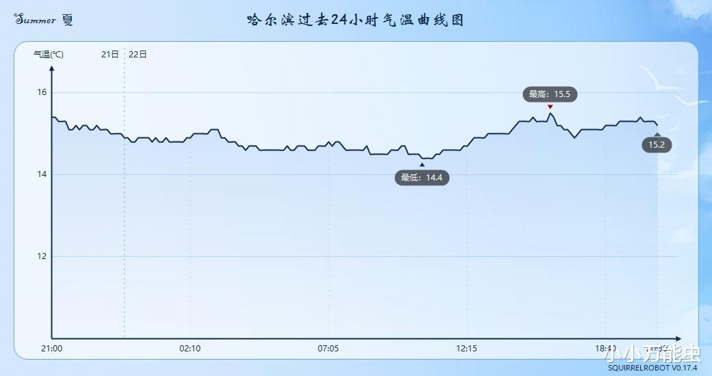 随着冷涡的南下,黑龙江哈尔滨在6月22日的最高气温仅为15.8度(出现在6月21日20时之后的夜间),这一温度刷新了当地6月下旬最高气温的最低纪录,而在6月22日全天,哈尔滨气温只有15度上下。除了哈尔滨异常清凉,下午黑龙江大部、吉林西部和内蒙古兴安盟的气温只有15到20度,体感异常凉爽。