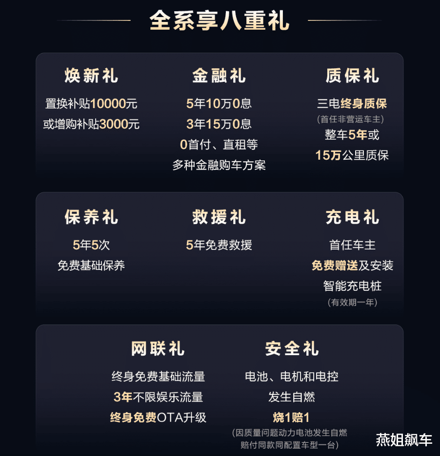 第八重,安全礼:电池、电机和电控发生自燃,烧1赔1(因质量问题动力电池发生自燃赔付同款同配置车型一台)。