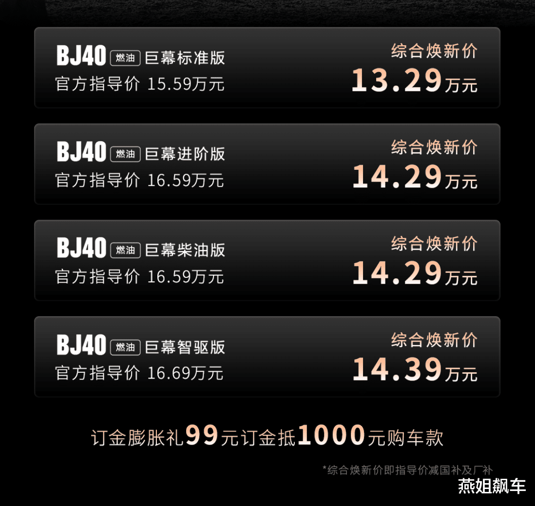北京越野BJ40燃油巨幕版官方指导价15.59—16.69万元,综合焕新价低至13.29万元。北京越野送上订金膨胀礼:1月27日下订,即可享受“99元订金抵1000元购车款”优惠政策。