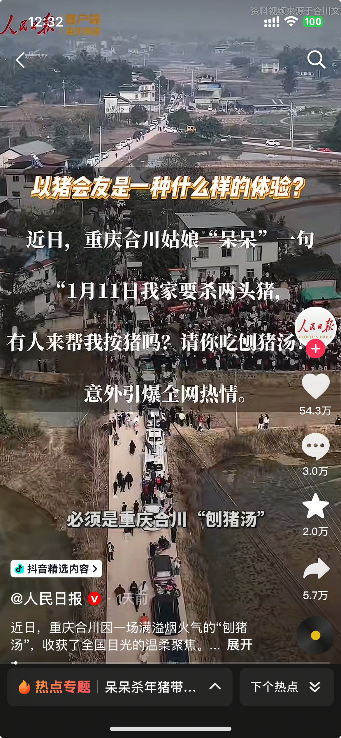2026年1月,重庆合川有一个女孩“呆呆”求网友帮忙杀年猪的短视频爆火了,在48小时内就有上万人陆续到场参与,“杀猪菜”冲到了好几个平台的热榜(《人民日报》也跟进了报道)。