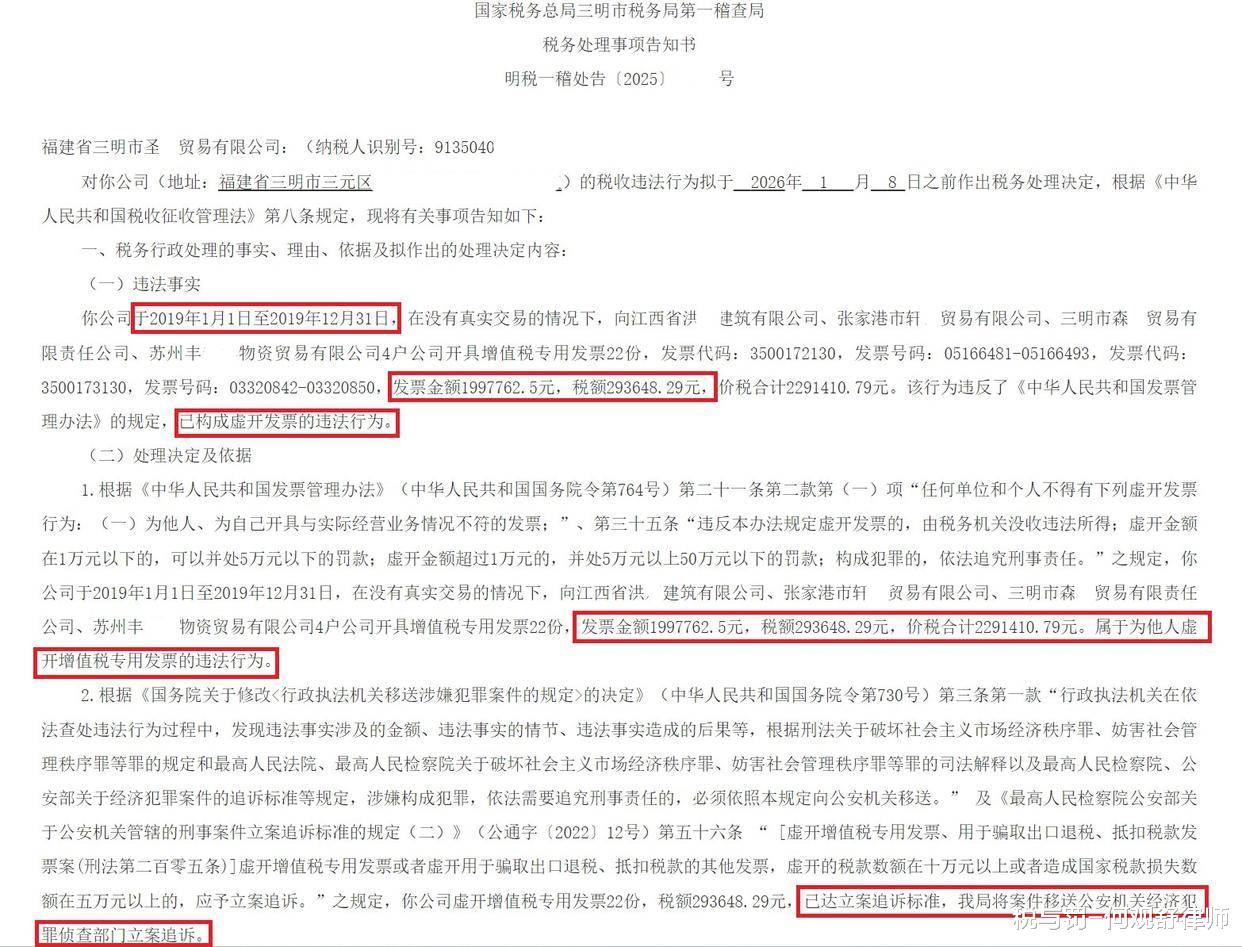 2025年11月28日,国家税务总局三明市税务局第一稽查局发布了《关于送达福建省三明市圣X贸易有限公司<税务处理事项告知书>的公告》,向福建省三明市圣X贸易有限公司送达《税务处理事项告知书》。福建省三明市圣X贸易有限公司对4家公司开具的增值税专用发票被认定为虚开发票,因涉嫌虚开增值税专用发票罪被移送公安机关立案侦查。