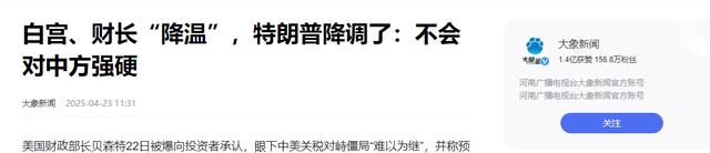 原文记载于大象新闻2025.04.23 关于:白宫、财长“降温”,特朗普降调了:不会对中方强硬