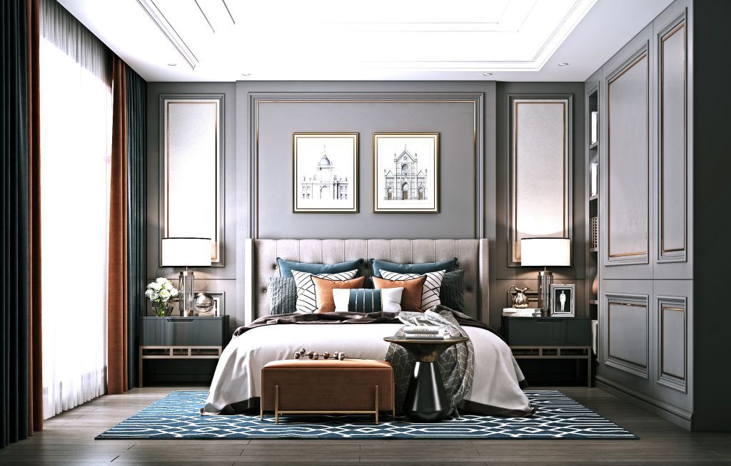 卧室以米白暖色软包床体,配以同色系的水晶主灯,帘头的设计也同样的欧式氛围,灰酷的整体感觉。亮金与灰色墙板显其贵族气息。