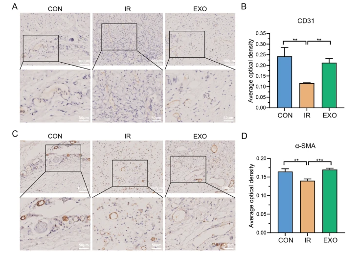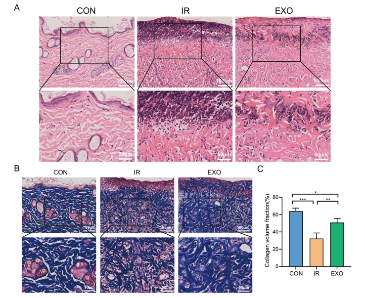 (插入图片:BMSCs - Exos对放射性皮肤损伤(RISI)的影响及组织学分析)进一步的病理学分析,为我们揭开了外泌体促进皮肤修复的几个关键秘密。首先,外泌体能够改善创面的组织结构,促进表皮再生,还能让胶原蛋白有序沉积,把原本紊乱的胶原纤维排列修复得整整齐齐。其次,外泌体具有促进血管生成的作用。它能提升损伤部位血管内皮标志物和血管平滑肌标志物的表达。这意味着什么呢?简单来说,就是新生的毛细血管增多了,而且血管结构变得更加成熟稳定,这样就能为正在修复的组织提供充足的血液和营养供应,让修复工作进行得更加顺利。