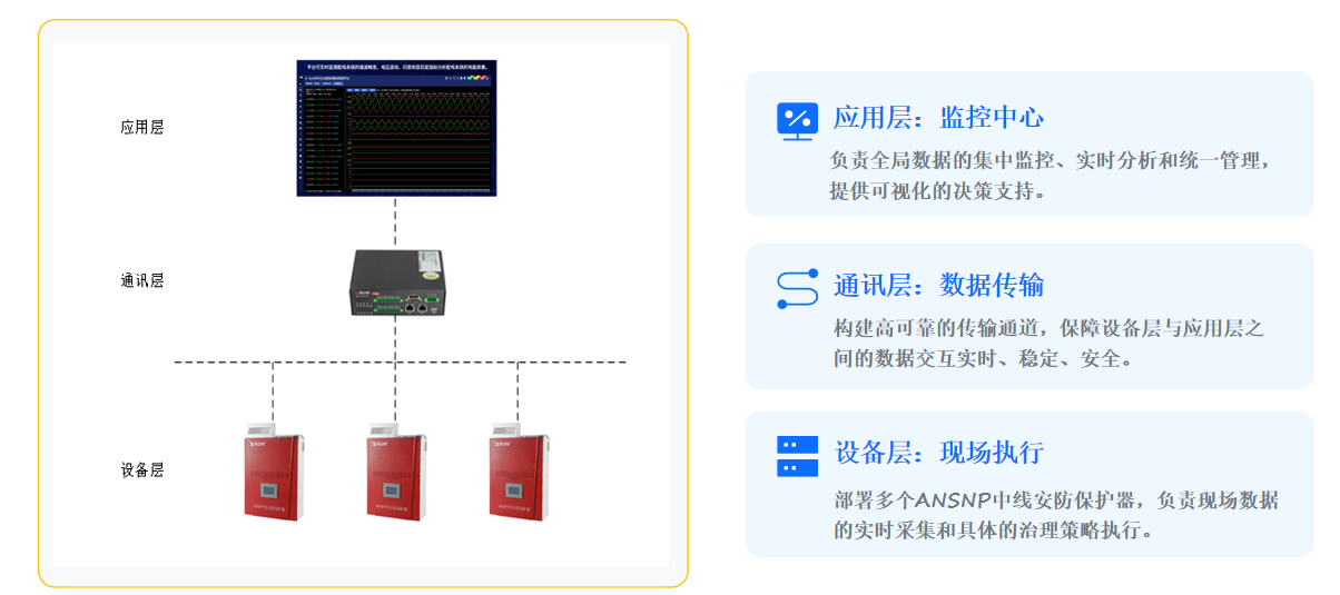 以 ANSNP 保护器为核心,安科瑞构建设备层 - 通讯层 - 应用层一体化智能治理系统,实现无人化高效运维: