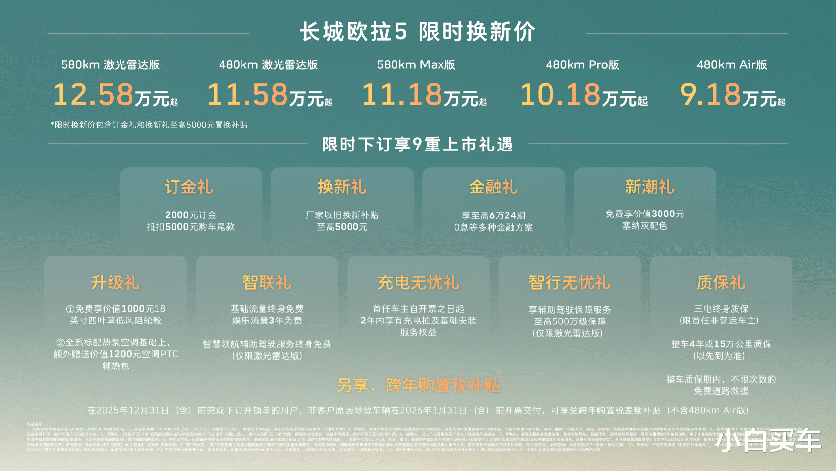【中国·保定】2025年12月16日——今日,长城汽车欧拉品牌全新A级纯电SUV——长城欧拉5正式上市。新车共推出5款配置,建议零售价区间为 9.98万至13.38万元,限时换新价9.18万元起(限时换新价包含“订金礼”和“换新礼”至高5000元以旧换新补贴)。为回馈广大用户的热爱与支持,即日起至2025年12月31日,用户下订并锁单即可尊享包含订金礼、换新礼、智行无忧礼在内的9重上市好礼,以及跨年购置税补贴(不含480km Air版)等丰厚购车权益。凭借诚意十足的价格权益与越级产品力,长城欧拉5致力于成为全球年轻用户的“严选搭子”。