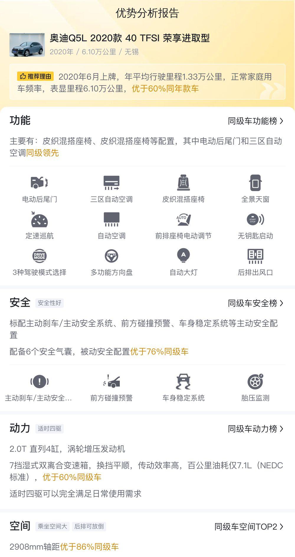 品牌:奥迪 车型:Q5L 年款:2020款 配置:40 TFSI 荣享进取型 里程:6.1万公里 价格:18.58万这辆Q5L,以其豪华的品牌、丰富的配置和相对较低的价格,吸引着不少消费者的目光。但二手车市场水深,购车需谨慎。希望本文的分析,能够帮助你做出更明智的购车决策。