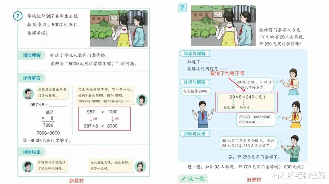 用估算解决问题,新教材继续强化了这一点。老教材中“用线段图解决问题”仅仅保留了估算解决问题。