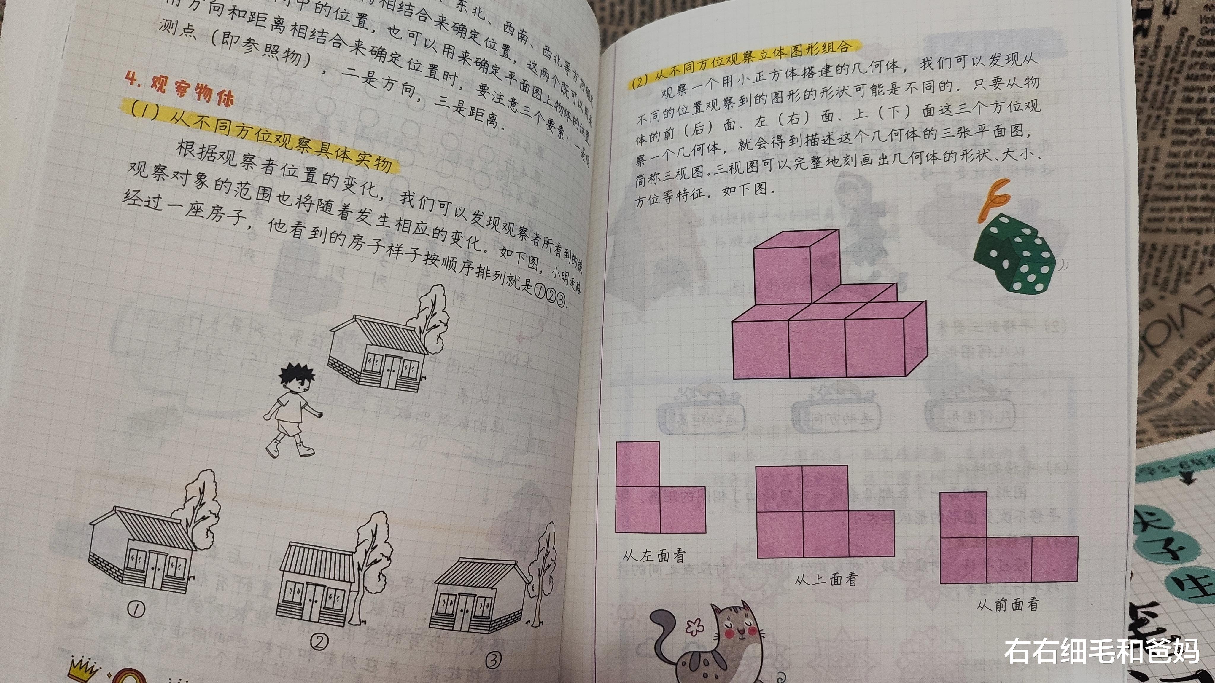 新版数学强调立体转化。如“观察物体”这一单元,旧教材的重点是从不同角度(正面、侧面、上面)观察立体图形。题型基本是“判断是从哪个方向观察到的”,或者“哪一幅图是从正面看到的”。旧教材的内容偏向“静态识别”。