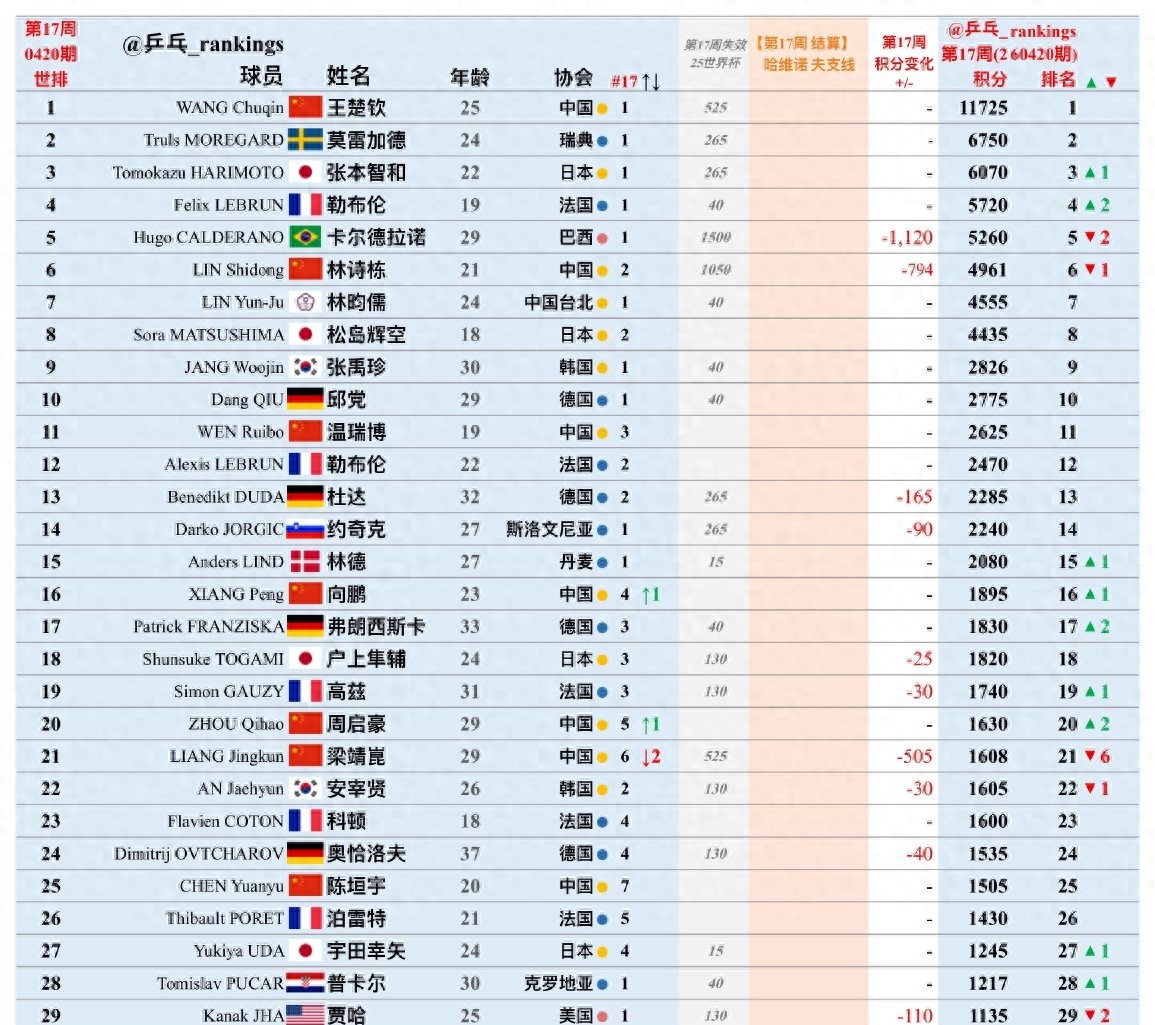 国乒选手周启豪排名上升了两位来到了第20名,梁靖崑减掉了505个有效积分排名,下滑了一位来到了第21名,跌出了世界前20。梁靖崑主要原因就是近期状态比较低迷,在世界杯赛被老将奥恰洛夫击败止步小组赛,没有打进淘汰赛。梁靖崑经验还是很丰富的,只不过状态起伏比较明显,领先的情况下,需要强化专注度,避免被对手追分。