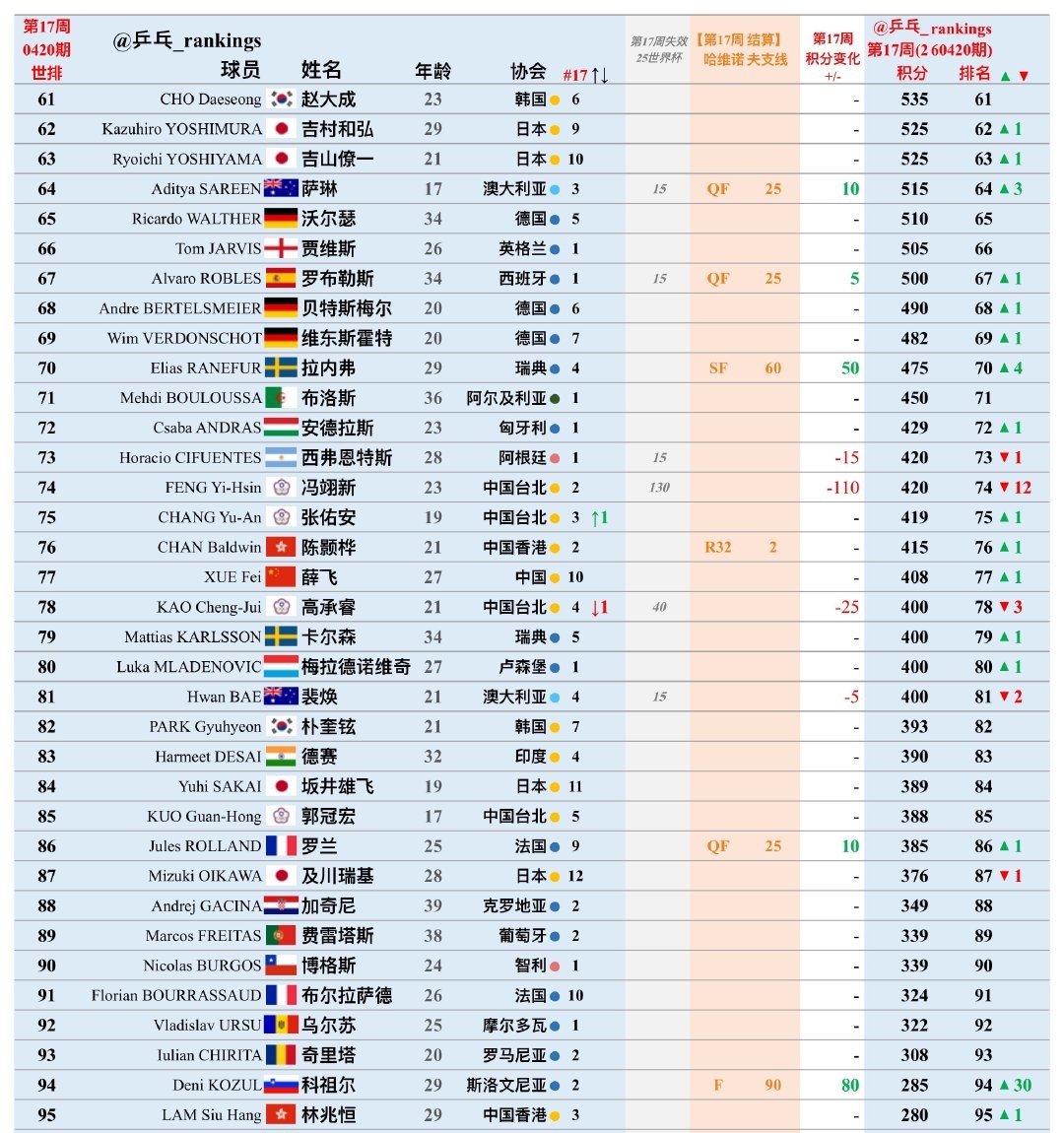 美国选手贾哈清除掉了110个有效积分后排名下滑,两位排名第29名。瑞典选手卡尔伯格清掉了105个积分,排名下降一位来到了第34名,他在世界杯的发挥没有达到预期。波兰选手雷德齐姆斯基减掉了30个积分排名下滑了三位,目前世界排名第46名。法国选手巴德在WTT哈维诺夫支线赛事打进四强增加了45个积分,排名上升了八位,目前世界排名第49名。