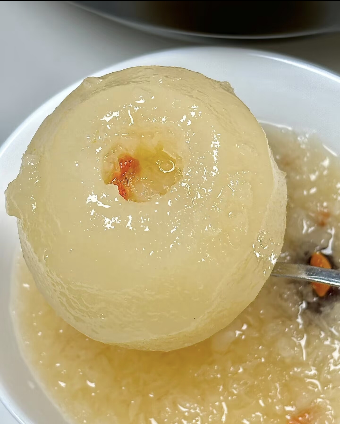 看看这碗羹,银耳软糯黏稠,雪梨晶莹剔透,红枣和枸杞点缀其中,看起来就特别诱人。舀上一勺,放入口中,银耳的黏糯、雪梨的清甜、红枣的香浓和枸杞的软糯完美融合,每一口都是满满的幸福感。这碗羹不仅能润肺去燥,还能美容养颜,特别适合冬天干燥的天气。