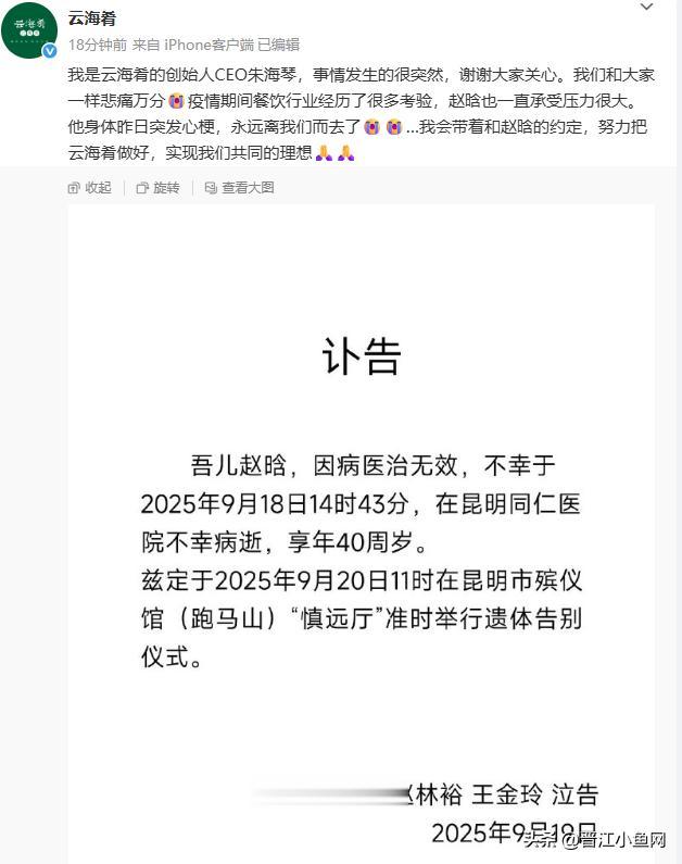知名云南菜品牌“云海肴”创始人赵晗先生,因突发心梗,于2025年9月18日14时43分在昆明同仁医院医治无效不幸逝世,年仅40岁。