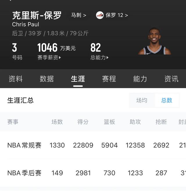 1330场的保罗保罗职业生涯1330场后,共拿下22809分5904篮板12358助攻2692抢断。作为一名身高1.83米的1号位,保罗职业生涯场均17.1分9.3助攻4.4篮板2抢断!他的生涯总得分排名全联盟第43位,助攻数则排在第三位,抢断排在第三位!从控球后卫的指标看,除了得分的数据外,助攻和抢断已经是NBA第一流水准!
